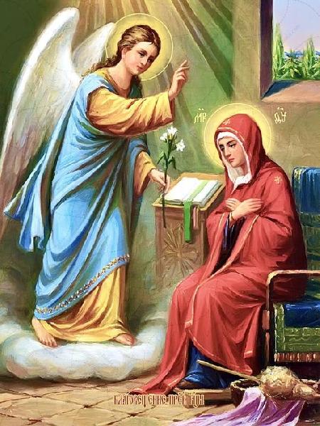 Мария в недоумении спросила Ангела, как может родиться сын у той, которая не знает мужа. И тогда Архангел открыл Ей истину, которую он принес от Всемогущего Бога: «Дух Святый найдет на Тебя, и сила Всевышнего осенит Тебя; посему и рождаемое Святое наречется Сыном Божиим». Постигнув волю Божию и всецело предавая Себя ей, Пресвятая Дева отвечала: «Се, раба Господня; да будет Мне по слову твоему».