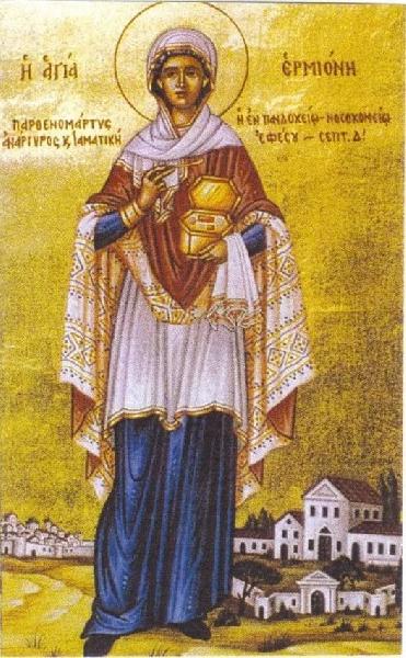 Свята мучениця Єрміонія була дочкою святого апостола Пилипа. Бажаючи побачити святого Іоанна Богослова, Єрміонія зі своєю сестрою Євтихією вирушила на пошуки святого до Асії (Мала Азія), але під час подорожі вони дізналися про смерть святого. Продовжуючи шлях, сестри зустріли учня апостола Павла Петронія і, наслідуючи його у всьому, стали його ученицями. Свята Єрміонія, володіючи лікарським мистецтвом, допомагала багатьом християнам і силою Христовою лікувала хвороби.
