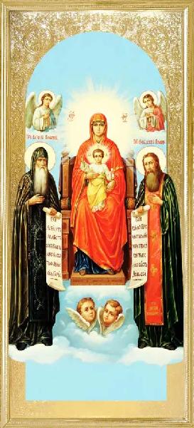 На іконі Матір Божа урочисто сидить на високому троні. Немовля Христос, що сидить на колінах Своєї Пречистої Матері, благословляє Божественною правицею Феодосія і Антонія Печерських (Антоній в гостроверхому схимницькому куколі), що стоять перед троном. Преподобні отці тримають в руках розгорнуті сувої з текстами духовних повчань. Текст на сувої Антонія: «Молю вас, чада: тримаємося помірності і не лінуємося, бо маємо в цьому Господа помічником».