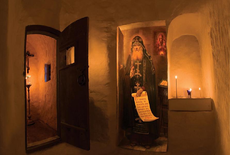 Все убранство келии составлял деревянный открытый гроб с большим надмогильным деревянным крестом у изголовья, на котором написан распятый Господь; в гробе немного соломы и убогое возглавие, и в таком виде служил он ложем успокоения затворнику, претружденному подвигом бдения молитвеннаго. Вот все успокоение, которое дозволял себе подвижник; затем небольшой налой у святых икон, деревянный обрубок, служивший вместо стула, кувшин для воды, горнец для пищи, нагорный тулуп, ветхая мантия с эпитрахилью и неугасаемая лампада — удовлетворяли все жизненныя потребности затворника; да еще неизменныя его тяжелыя железныя вериги и жесткая власяница, которыя носил он на своем теле и которыя сами составляли немалое испытание своею тяжестию и остротою.