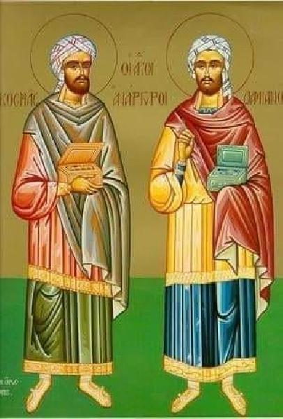 Святі мученики безсрібники Косма і Даміан Аравійські ходили містами і селами, проповідуючи Христа і зцілюючи хворих силою Христовою. За надану допомогу святі не брали плати. У Кілікії язичники схопили святих лікарів та привели до правителя Лісія. За відмову зректися християнської віри правитель наказав жорстоко бити святих, а потім утопити в морі, але Ангел Божий виніс їх з безодні на берег. Тоді язичники обезголовили святих. Разом зі святими лікарями були закатовані їхні брати Леонтій, Анфім та Євтропій. (Не можна плутати святих Косму та Даміана Аравійських з іншими безсрібниками, з такими ж іменами, пам'ять яких 1 листопада та 1 липня.)