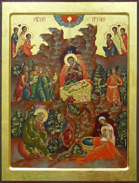 Прииде воплощься Христос Бог наш, из чрева Его же Отец прежде денницы раждает. Правления же держа пречистых сил, в яслех скотиих возлежит, и пеленами повивается, разрешает же много плетенныя пленицы прегрешении.