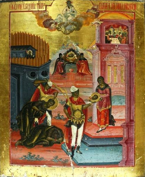 Усекновение главы Иоанна Предтечи произошло во время пира в честь дня рождения Ирода, на котором присутствовали вельможи, старейшины и тысяченачальники. Дочь Иродиады Саломия (Саломея) танцевала перед гостями, расположив тем самым к себе Ирода, который поклялся дать ей все, что она ни попросит – хотя бы даже и половину своего царства. По наговору своей матери Иродиады, у которой появилась возможность отомстить святому Иоанну и навсегда избавиться от упреков и обличений, Саломея попросила дать ей голову Иоанна Крестителя и принести ее на блюде. Ирод смутился, так как боялся гнева Божия за убийство пророка, а также народного гнева, поскольку Предтеча был любим жителями Галилеи. При этом из Евангелий известно, что Ирод во многом слушал святого Иоанна и поступал по его словам – но, как пишет свт. Иоанн Златоуст, правитель «царствовал над удовольствиями, вернее, был рабом удовольствий». Златоуст полагает, что, скорее всего, клятвой Ирод прикрылся, как благовидным предлогом – на самом же деле, истинной причиной его поступка была боязнь потерять Иродиаду.