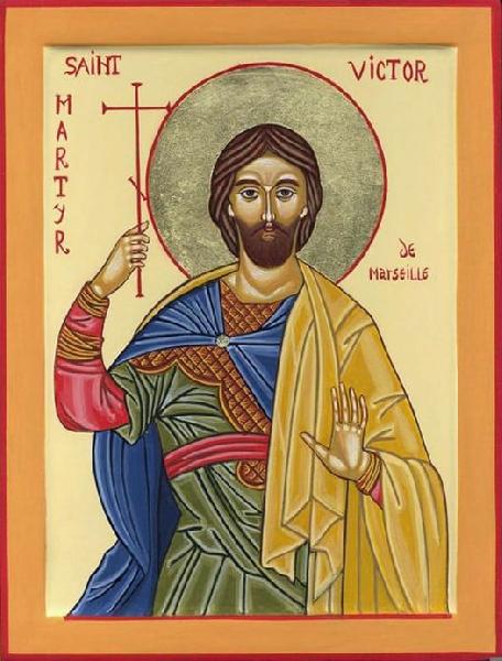 Мученик Виктор Марсельский[*] (ок. 290 г.) был офицером римской армии, который во время гонения императора Максимиана ободрял марсельских христиан и призывал их храбро исповедовать Христову веру. Когда он осудил служение идолам перед префектами его легиона, его провлачили по улицам города и затем бросили в темницу. В темнице он обратил ко Христу трех солдат: Лонгина, Александра и Фелициана, которые тут же были казнены. А сам св. Виктор был сокрушен под жерновом, "подобно пшенице, выбранной Богом".